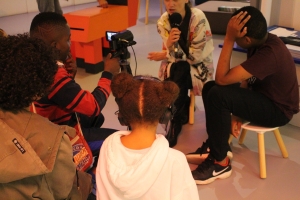 Les participants, de 10 à 15 ans, accompagnés par l’artiste Sarah Brown, jouent les web-reporter curieux ! Après un temps de recherche et de rédaction des questions, ils se saisissent de leur caméra, micro, (parfois fond vert!). Au-delà de la pratique, ils découvrent également l’arrière du décor du monde de l’information et développent un regard critique sur les médias.
