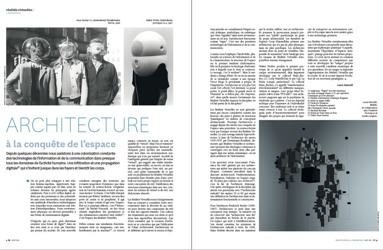 Les Réalités Virtuelles ne sont généralement pas encore considérées comme des facteurs clés aptes à générer de nouveaux « paradigmes » en matière de conception architecturale. Pourtant l’architecture a engagé depuis des siècles une conquête de l’espace sans précédent. La science-fiction n’est pas l’unique vecteur des Réalités Virtuelles. Le seul ouvrage intitulé Superarchitecture, le futur de l’architecture des années 1950-1970, par Dominique Rouillard, démontre que Réalités Virtuelles et architecture épousent des idéologies communes et convergent vers un futur dont elles partagent déjà une même sémantique; on est aussi architecte de l’information.
