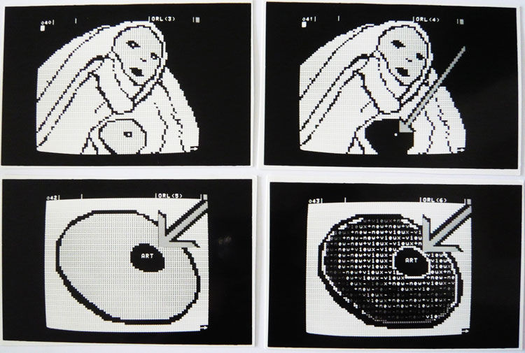 L’art avec le Vidéotex a existé dans divers pays dont le Canada (animations réalisées par Nell Tenhaaf) et le Brésil (7) où Eduardo Kac créa un ensemble de poèmes animés dont il a effectué des remédiations (8). Mais c’est en France que cette création fut la plus importante. Elle s’articule autour de ART ACCES Revue d’une part, et de projets indépendants d’autre part. À ce jour, j’ai identifié 73 artistes pour la première et 33 œuvres portées par 8 artistes ou groupe d’artistes pour les seconds (9). Dans les deux cas, ces chiffres ne sont pas définitifs.