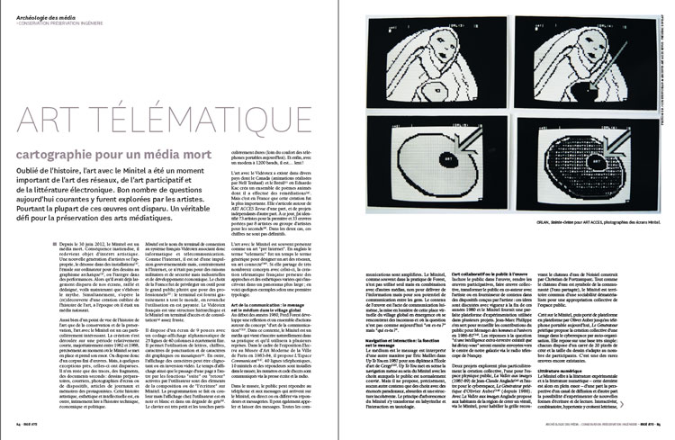 Oublié de l’histoire, l’art avec le Minitel a été un moment important de l’art des réseaux, de l’art participatif et de la littérature électronique. Bon nombre de questions aujourd’hui courantes y furent explorées par les artistes. Pourtant la plupart de ces œuvres ont disparu. Un véritable défi pour la préservation des arts médiatiques.