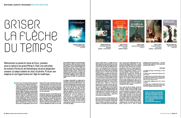 Réinventant le passé à l’aune du futur, placées sous le spectre du grand Philip K. Dick, les uchronies de science-fiction et de fantastique les plus déjantées cassent le temps linéaire du récit littéraire. À relier aux samples et aux hypertextes de l’âge du numérique…