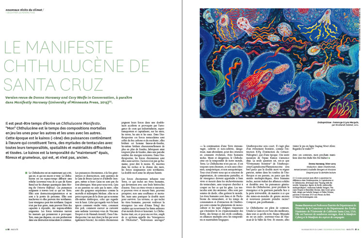Version revue de Donna Haraway and Cary Wolfe in Conversation, à paraître dans Manifestly Haraway (University of Minnesota Press, 2015) : ce texte poursuit l’effort de Donna Haraway à caractériser les différences entre l’Anthropocène, le Capitalocène et le Chthulucène, développé dans « Staying with the trouble: Sympoièse, figures de ficelle, embrouilles multispécifiques », traduction Isabelle Stengers, Vinciane Despret et Benedikte Zitouni, dans Gestes spéculatifs, dirigés par Isabelle Stengers et Didier Debaise, parution à l’automne 2015 aux Presses du Réel.