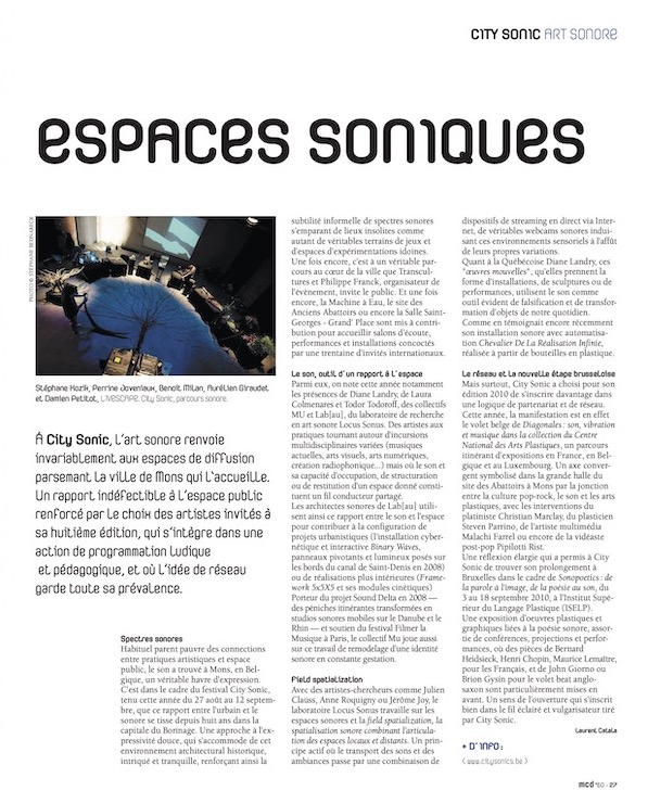 Habituel parent pauvre des connections entre pratiques artistiques et espace public, le son a trouvé à Mons, en Belgique, un véritable havre d’expression. C’est dans le cadre du festival City Sonic, tenu cette année du 27 août au 12 septembre, que ce rapport entre l’urbain et le sonore se tisse depuis huit ans dans la capitale du Borinage. Une approche à l’expressivité douce, qui s’accommode de cet environnement architectural historique, intriqué et tranquille, renforçant ainsi la subtilité informelle de spectres sonores s’emparant de lieux insolites comme autant de véritables terrains de jeux et d’espaces d’expérimentations idoines.