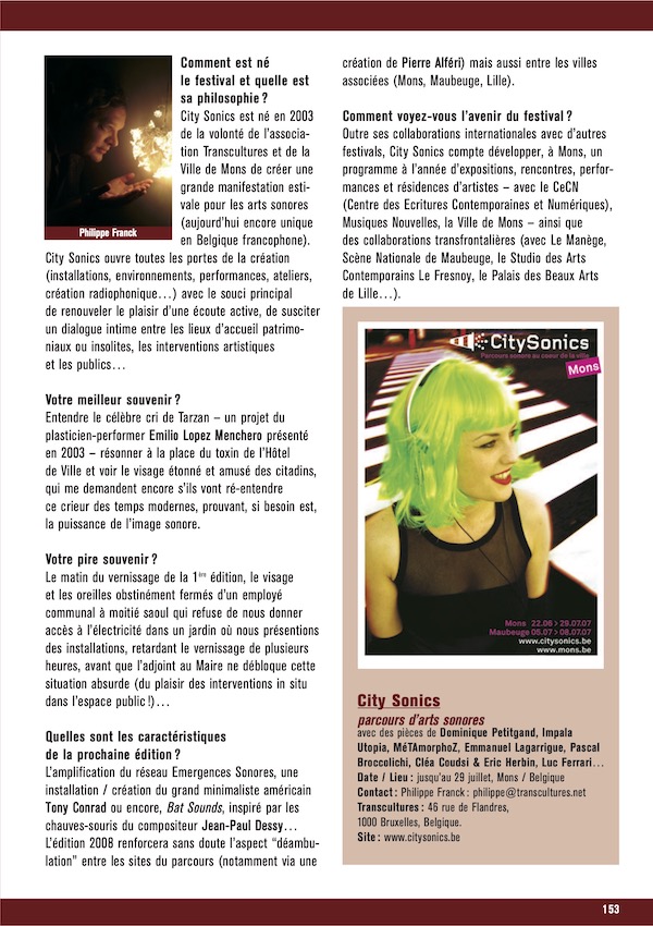 L’amplification du réseau Émergences Sonores, une installation / création du grand minimaliste américain Tony Conrad ou encore, Bat Sounds, inspiré par les chauves-souris du compositeur Jean-Paul Dessy… L’édition 2008 renforcera sans doute l’aspect « déambulation » entre les sites du parcours (notamment via une création de Pierre Alféri), mais aussi entre les villes associées (Mons, Maubeuge, Lille).