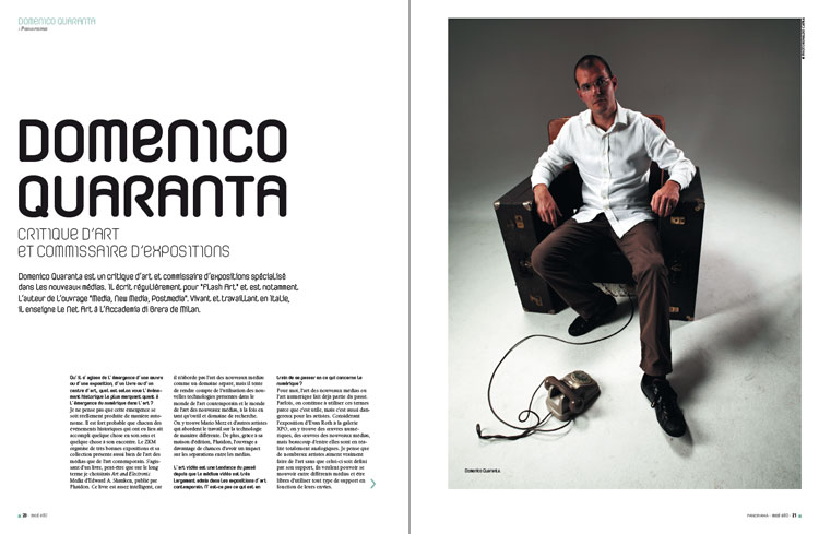 Domenico Quaranta est un critique d’art et commissaire d’expositions spécialisé dans les nouveaux médias. Il écrit régulièrement pour Flash Art et est notamment l’auteur de l’ouvrage Media, New Media, Postmedia. Vivant et travaillant en Italie, il enseigne le Net Art à l’Accademia di Brera de Milan.