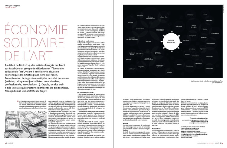 Au début de l’été 2014, des artistes français ont lancé sur Facebook un groupe de réflexion sur « l’économie solidaire de l’art », visant à améliorer la situation économique des artistes plasticiens en France. En septembre, la page réunissait plus de 2200 personnes (artistes, critiques et journalistes, commissaires, professionnels, associations…). Depuis, un site web a pris le relais qui structure et présente les propositions. Nous publions le manifeste du projet.