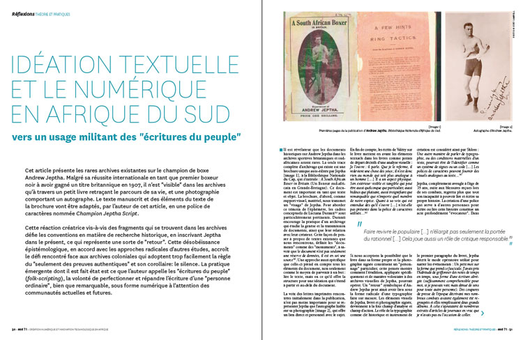 Cet article présente les rares archives existantes sur le champion de boxe Andrew Jeptha. Malgré sa réussite internationale en tant que premier boxeur noir à avoir gagné un titre britannique en 1907, il n’est « visible » dans les archives qu’à travers un petit livre retraçant le parcours de sa vie, et une photographie comportant un autographe. Le texte manuscrit et des éléments du texte de la brochure vont être adaptés, par l’auteur de cet article, en une police de caractères nommée Champion Jeptha Script.