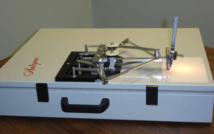 L’histoire de la technologie nous présente un objet qui, paradoxalement, exclut toute trace d’idéation humaine dans le procédé de parfaite duplication d’une signature humaine. Ceci est manifeste dans l’Autopen (l’Autostylo [image 4]), une machine à signature automatique datant des années ’60, particulièrement et fréquemment utilisée aux États-Unis sous la présidence de John F. Kennedy (8). Cette pratique, qui consiste à utiliser une machine pour signer physiquement des documents officiels (pratique perpétuée à ce jour dans les services de Barack Obama), a conduit à la production d’un certain nombre de systèmes ultérieurs et de produits commerciaux comme le Ghostwriter (le « prête-plume » – Image 5). Ces machines-à-signature utilisent le code visuel d’une signature pour reproduire une matérialité autorisée en quantités illimitées.
