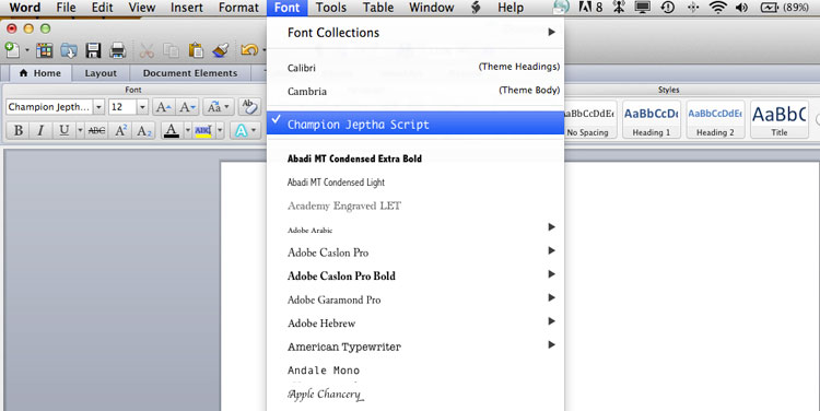 La police de caractères Champion Jeptha Script testée sur le système d’exploitation Mac OS (Apple Macintosh). Photo: © Kurt Campbell.