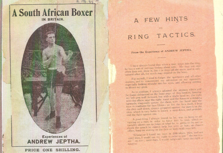 Il est révélateur que les documents historiques sur Andrew Jeptha dans les archives sportives britanniques et sud-africaines soient rares. La seule trace complète d’archivage qui existe est une brochure unique auto-éditée par Jeptha [image 1], à la Bibliothèque Nationale du Cap, qui s’intitule : A South African Boxer in Britain (Un Boxeur sud-africain en Grande-Bretagne). Ce document est important en tant que texte et objet. La brochure, d’abord, comme support visuel, matériel, nous transmet un « visage » de Jeptha. Pour aborder ce témoin de l’éphémère, les cadres conceptuels de Luciana Duranti (3) sont particulièrement pertinents. Duranti encourage la pratique d’un archivage qui étudie la genèse et la transmission de documents, ainsi que leur relation avec leur créateur. Cette façon de penser à propos de textes existants que nous rencontrons définit les « documents » comme des « monuments », à savoir que le document n’est pas seulement une réserve de données, il est en soi une source (4). Une approche aussi spécifique que celle-ci prend en compte tous les éléments du document, non seulement comme le moyen de parvenir à un but : lire le texte, mais en ce qu’il offre la structure pour une idéation qui s’étend à partir et au-delà du document.