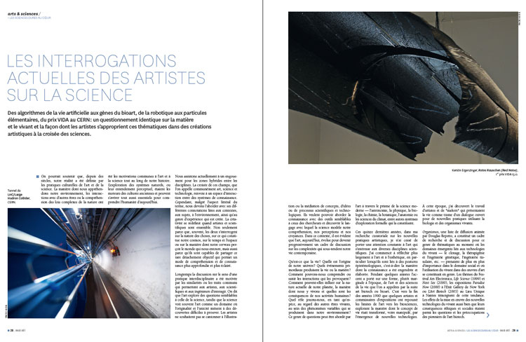 Des algorithmes de la vie artificielle aux gènes du bioart, de la robotique aux particules élémentaires, du prix VIDA au CERN : un questionnement identique sur la matière et le vivant et la façon dont les artistes s’approprient ces thématiques dans des créations artistiques à la croisée des sciences.