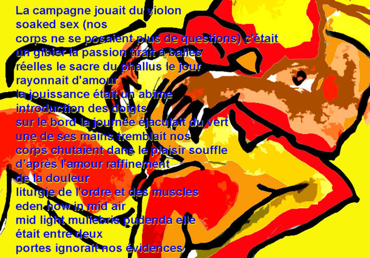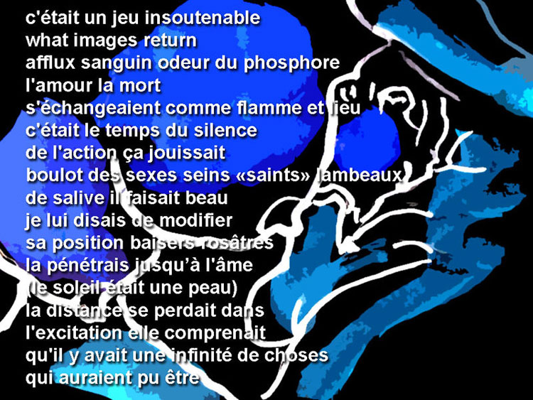 Il y a de tout dans cette hyperfiction qui essaie d’imaginer modestement une littérature propre à l’espace chaotique et multipolaire d’internet, y compris l’accueil de propositions extérieures volontaires ou involontaires. Les poèmes de Marc Hodges à Gilberte, par exemple sont réalisés à partir de dessins de Jean-Blaise Évequoz qui subissent des traitements informatiques dont il n’est pas le maître. À partir du moment où vous déposez quoi que ce soit sur Internet, ce dépôt devient un objet commun soumis à une forme d’intelligence, de créativité collective. C’est bien pour cela que la notion de « propriété » n’y est pas adéquate.