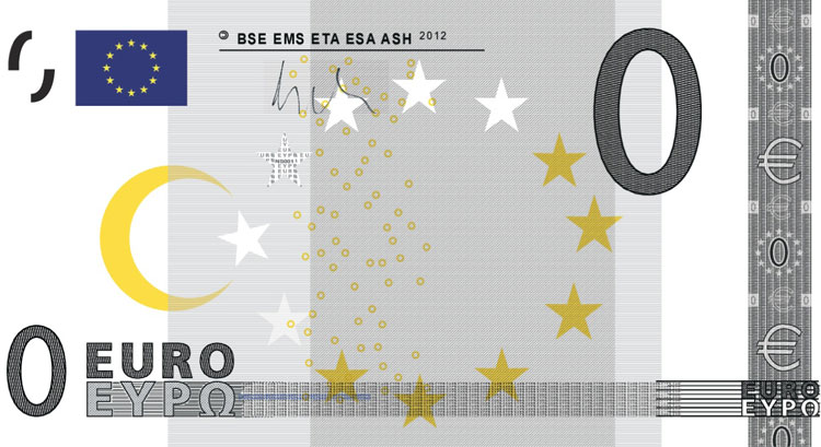 Le 0EURO est l’ajout parfait à la série de billets déjà existants en euros. Il mesure 113 x 55 mm. Soit une taille inférieure proportionnellement à celle du billet de 5 euros et qui correspond exactement à ce que serait (s’il existait) le billet de 1 euro. Avec le lancement des billets en euro le 1er janvier 2002, l’Union européenne a non seulement créé une zone de monnaie commune (suite à l’instauration d’une zone économique commune), les billets en euro sont aussi devenus les vecteurs d’une identité et d’une solidarité européennes communes. La devise politique a elle aussi acquis ses billets : pour éviter toute discorde entre États membres, les dessins de la première série de billets d’euros signés Robert Kalina, un illustrateur autrichien spécialisé dans la monnaie, ne représentent aucun bâtiment ou personnage réel, mais des édifices fictifs prototypiques d’ères et de styles architecturaux de l’histoire européenne.