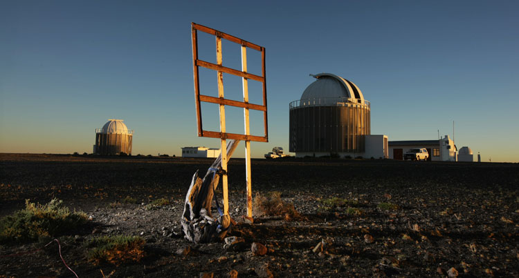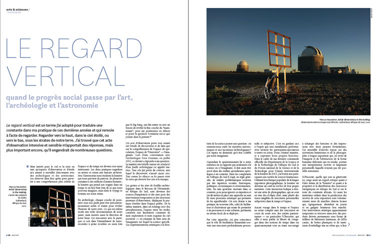 Un autre exemple de ce type d’approche participative en partenariat avec les sciences est la collaboration avec l’artiste Bronwyn Lace à Sutherland. Sutherland est un lieu magnifique et unique au monde. La petite ville est située au milieu du désert sud-africain du Karoo. Comme une grande partie du Karoo, elle est connue pour sa « vacuité ». Ses qualités d’obscurité et de silence sont difficiles à trouver ailleurs. Ses vastes étendues de terres vierges et de cieux cristallins permettent une observation et une contemplation qui nous étaient étrangères (à nous artistes) avant ce projet. Ces qualités y ont attiré les astrophysiciens il y a quelques décennies. Ainsi, à seulement 7km de la ville l’on trouve l’Observatoire Astronomique Sud-Africain (SAAO), équipé de plus de douze télescopes internationaux et du Grand Télescope Sud-Africain (SALT/Southern African Large Telescope), l’un des télescopes les plus puissants au monde. Malgré la beauté du lieu et la proximité d’un projet scientifique international d’une telle envergure, la communauté de Sutherland, qui compte à peine plus de 4000 habitants, fait face à l’autre aspect de l’isolement : le chômage et l’alcoolisme touchent de larges portions de cette communauté éclatée.