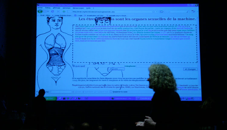 Trois pages de php, une vingtaine d’ordinateurs connectés, autant de personnes écrivent pendant 30 minutes ensemble en ajoutant en effaçant trois textes. Ainsi l’artiste du réseau Annie Abrahams présenta-t-elle en 2009 à la Chartreuse de Villeneuve Lez Avignon trois expérimentations d’écriture partagée.