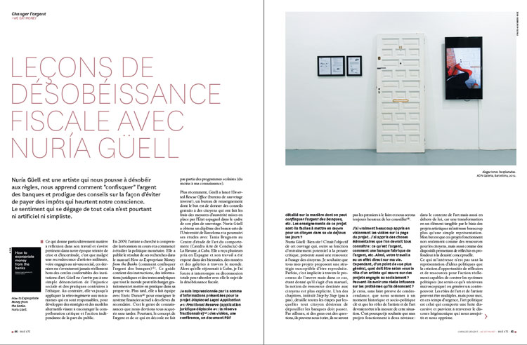 Nuría Güell: Bien sûr ! C’était l’objectif de cet ouvrage qui, outre sa fonction d’entraînement potentiel à la pensée critique, présente aussi une ressource à l’usage des citoyens. Je souhaite que tous mes projets proposent une stratégie susceptible d’être reproduite. Parfois, c’est implicite à travers le processus de l’œuvre mais dans ce cas, étant donné qu’il s’agit d’un manuel, la notion de ressource destinée aux citoyens est plus explicite. L’un des chapitres, intitulé Step by Step (pas à pas), détaille toutes les étapes par lesquelles tout citoyen désireux de dépouiller les banques doit passer. Par ailleurs, si des gens ont des questions, ils peuvent nous écrire, ils ne seront pas les premiers à le faire et nous serons toujours heureux de les conseiller (4).