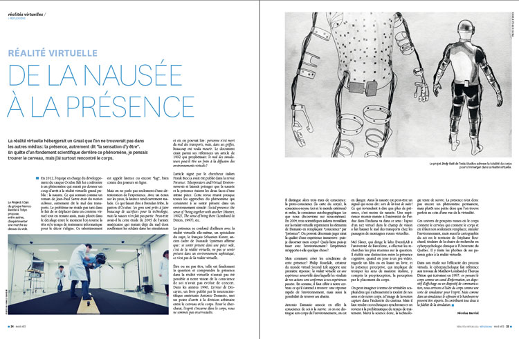 L’article signé par le chercheur italien Frank Biocca avait été publié dans la revue Presence : Teleoperators and Virtual Environnements et laissait présager que la nausée et la présence étaient les deux faces d’une même pièce. Cette revue réunit presque toutes les approches du phénomène qui consistent à se sentir présent dans un environnement simulé : Social presence: the sense of “being together with another (Heeter, 1992), The sense of being there (Lombard & Ditton, 1997), etc.