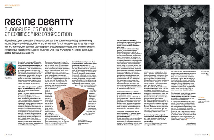 Régine Debatty est commissaire d’exposition, critique d’art et fondatrice du blog We make money not art. Originaire de Belgique, elle vie entre Londres et Turin. Connue pour ses écrits à la croisée de l’art, du design, des sciences, technologies et problématiques sociales. Elle anime une émission radiophonique hebdomadaire et est co-auteur du livre New Art/Science Affinities et est aussi membre du Royal College of Art.