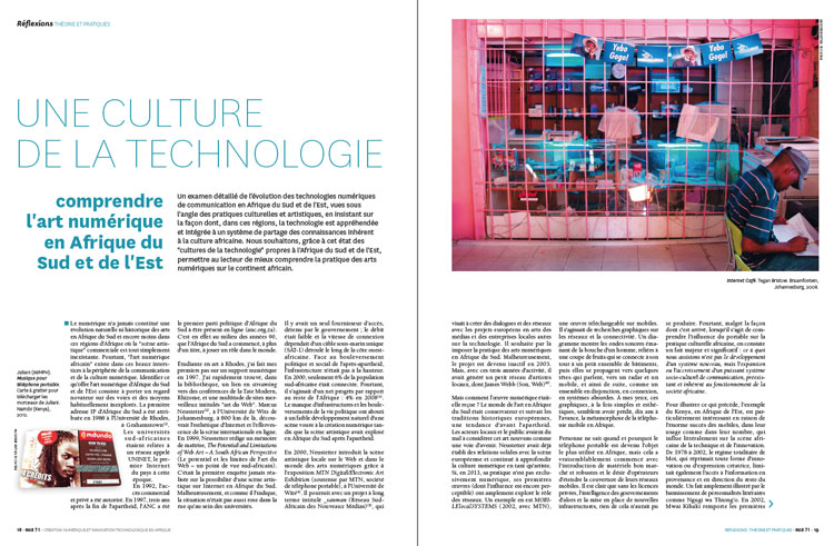 Un examen détaillé de l’évolution des technologies numériques de communication en Afrique du Sud et de l’Est, vues sous l’angle des pratiques culturelles et artistiques, en insistant sur la façon dont, dans ces régions, la technologie est appréhendée et intégrée à un système de partage des connaissances inhérent à la culture africaine. Nous souhaitons, grâce à cet état des « cultures de la technologie » propres à l’Afrique du Sud et de l’Est, permettre au lecteur de mieux comprendre la pratique des arts numériques sur le continent africain.