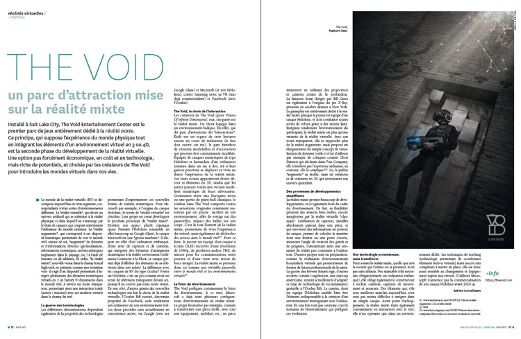 Installé à Salt Lake City, The Void Entertainement Center est le premier parc de jeux entièrement dédié à la réalité mixte. Ce principe, qui suppose l’expérience du monde physique tout en intégrant les éléments d’un environnement virtuel en 3 ou 4D, est la seconde phase du développement de la réalité virtuelle. Une option pas forcément économique, en coût et en technologie, mais riche de potentiels, et choisie par les créateurs de The Void pour introduire les mondes virtuels dans nos vies.