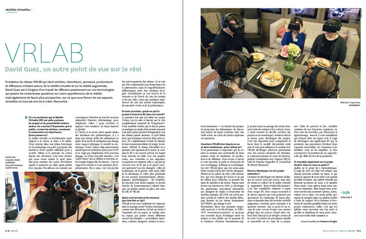Fondateur du réseau VRLAB qui réuni artistes, chercheurs, penseurs, producteurs et diffuseurs orbitant autour de la réalité virtuelle et sur la réalité augmentée, David Guez est à l’origine d’un travail de réflexion passionnant sur ces technologies qui posent de nombreuses questions sur notre appréhension de la réalité, mais également de façon plus prospective, sur ce que nous ferons de ces espaces virtuelles où tout est encore à créer. Rencontre.