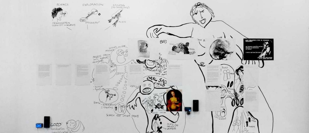 Enfin, l’approche politique était assurée par Estelle Benazet Heugenhauser & Cindy Coutant aka L4bouche. Leur installation Jupiter Space se présente comme une fresque avec des collages, dessins, photos et fragments de textes signés, par exemple et au hasard, par Ulrike Meinhof… La source de cette installation qui s’érige contre la domination masculiniste et le contrôle des corps est un texte de la chercheuse Zoë Sofia — à laquelle Donna Haraway doit beaucoup — publié dans les années 80 dans la revue Diacritics. Intitulé Exterminer les fœtus : avortement, désarmement, sexo-sémiotique de l’extra-terrestre, ce manifeste a été traduit justement par L4bouche et vient juste de paraître en français aux éditions Excès.