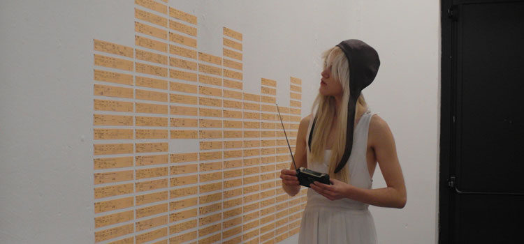 Si les accidents graves demeurent rares donc, les incidents matériels sont en revanche plus nombreux, comme en témoignent les annotations reportées sur les strips des contrôleurs aériens. On en a un aperçu en regardant ces dizaines de bristols rectangulaires agencés dans le couloir du Bel Ordinaire, l’espace qui accueille l’exposition Vu Du Ciel organisée par Agnès de Cayeux — commissaire invitée par Pauline Chasseriaud, directrice du Festival Accès)s(. Ils servent en quelque sorte de « balises » pour l’installation A.V.I.O.N qui « joue » sur, de et avec des sons collectés (communications, ambiance d’aéroport, bruits de moteurs, etc.) et diffusés par le biais d’enceintes directives infra-soniques. Une mise en onde en trois mouvements : vol, brouillage et crash suite au hacking possible des systèmes de navigation (c’est très rassurant… ;). Muni d’une « radio dynamo » (i.e. avec manivelle) retransmettant cette dramaturgie sonore, le public est invité à « parasiter » l’espace d’exposition.
