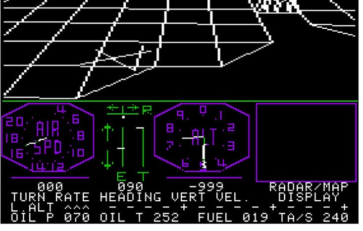 Ce futur incertain contraste avec un passé que l’on peut contempler également dans cette exposition. Une collection de consoles et vieux ordinateurs retrace l’histoire (si ce n’est la pré-histoire) des simulateurs de vol. Dans le genre madeleine, le bruit du clavier de l’Apple IIe nous fait voyager dans le temps. On replonge à l’orée des années 80s. En 1983 très précisément. Pas d’Internet, ni de portable. Des disquettes grand format (floppy). Un écran noir avec des filets verts. Et notre imagination sans limites qui fait le reste. Se concrétisent alors labyrinthes suintants et tavernes louches (Bard’s Tale) et, dans le cas qui nous intéresse, des vols de nuit au-dessus de paysages verdoyants comme des terrains de golf (Flight Simulator II). La suite, comme on peut le voir (« vu d’en haut », « vue embarquée », etc.), s’écrit en couleur, avec des manettes sophistiquées et un rendu plus réaliste au fil de l’évolution des consoles (Atari, Nintendo, etc.).