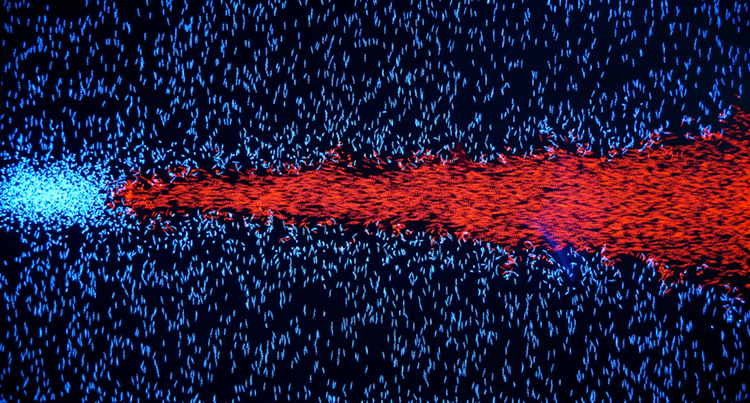 Dans ces oeuvres minimales et abstraites, les mouvements infinis des formes élémentaires, pixels, lignes, carrés […] recréent à l’écran des processus inspirés du réel, des particules élémentaires, des masses du cosmos, des foules d’humains, des noeuds psychiques, des mouvements du corps, ou encore de systèmes issus de théories psychanalytiques, philosophiques, scientifiques, ou sociologiques.