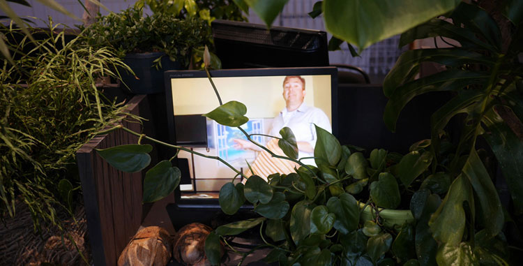 Stéphane Degoutin et Gwenola Wagon, dont on ne compte plus le nombre de collaborations, ont balayé une large partie du spectre des « dérives » de notre époque : automatisation du traitement des produits, du vivant et des données, images virales, collecte des données et géolocalisation, mythologie des infrastructures modernes… Pour Digital Dérives, ils s’attaquent à la religion du travail au travers d’une installation vidéo (Institut de néoténie pour la fin du travail). Entre Le Monde vert de Brian Aldiss et Brazil de Terry Gilliam, ils mettent en scène des employés de bureau en proie à des tâches sans fin et sans but, prisonnier dans leur open-spaces progressivement envahit de végétation, cherchant en vain à échapper à leur sort par des dérivatifs et jeux régressifs.