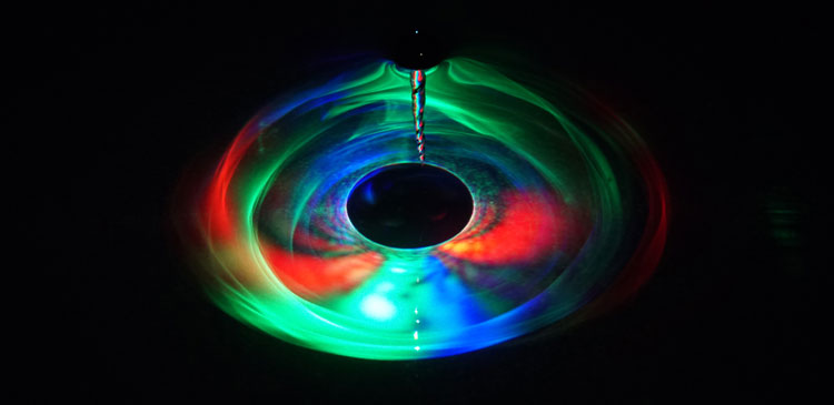 Evelina Domnitch & Dmitry Gelfand sont aussi fascinés par les trous noirs. Avec Orbiheron, ils recréent un vortex en jouant sur des effets d’optiques dans un bassin rempli d’eau, matérialisant ainsi les aberrations lumineuses et physiques observables aux abords de ces monstres cosmiques. Le duo d’artistes présente également Hydrogeny, une installation qui déploie les volutes des irisations colorées de l’hydrogène grâce à un système d’électrolyse.