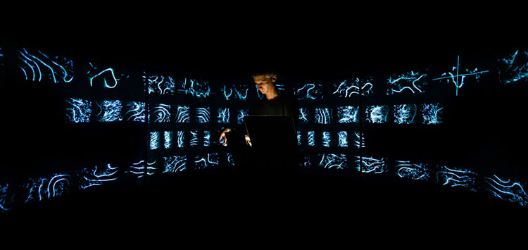Même position pour expérimenter l’Abîme de Visual System. L’espace est un peu plus contraint que celui dont dispose Bauder & Henke, mais la pratique est la même : confortablement allongé, le public se laisse envoûter par les figures géométriques générées par cette installation vidéo. Cette configuration renforce encore plus le côté hypnotique de cette expérience sensorielle, comparé à la version projetée frontalement sur multi-écrans.