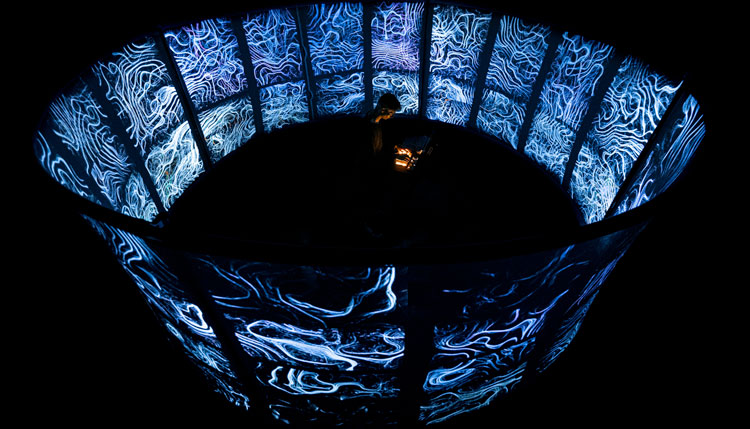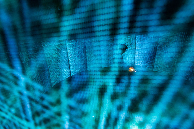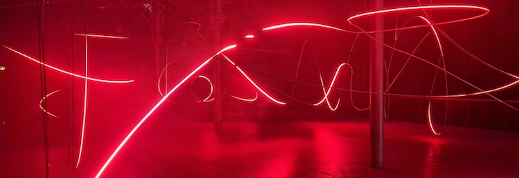 Outre une sensation de profondeur, la lumière peut aussi suggérer le mouvement. C’est le cas avec Spiraling Into Infinity de Children Of The Light (Christopher Gabriel + Arnout Hulskamp). Une sculpture lumineuse toute en courbes, composée de longs « spaghettis » transparents dans lesquels courent des lumières colorées, synchro avec la musique mystérieuse de Jakob Lkk. Les visiteurs sont libres d’évoluer au sein de cette installation et en quelque sorte de se connecter, si ce n’est d’interagir, avec ce flux lumineux.