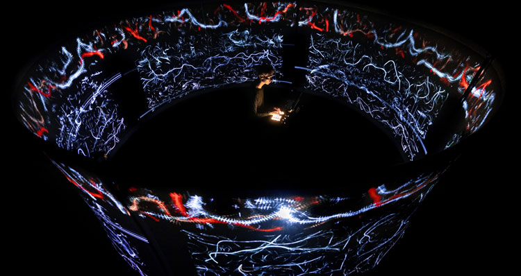 Bien évidemment la contemplation de la voûte céleste requiert le même genre de dispositif. C’est ce que propose Quiet Ensemble avec Solardust : une nuée de petites lumières qui scintillent, changent de couleurs et de textures. Ces particules lumineuses qui semblent parcourues d’arcs électriques ont une « épaisseur », une « réalité » holographique qui donne l’impression de se baigner dans la capture d’écran d’un télescope spatial.