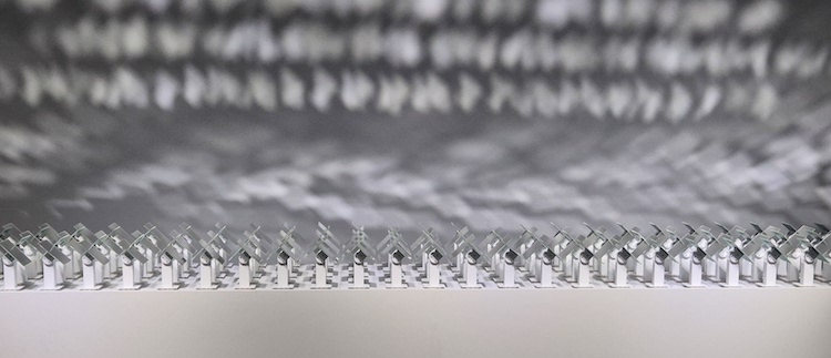 La plongée dans cette exposition se fait en passant par un grand corridor qui accueille Beyond, l’installation de Playmodes. Dans la lignée d’une de leur autre création (WaveFrame), le tandem espagnol Eloi Maduell et Santi Vilanova propose une déambulation sonore et lumineuse sur près de 20 mètres avec un fond blanc en ligne de mire. Les traits de lumière en forme de « U » inversé soulignent la forme de cette structure et leurs clignotements démultiplient l’impression de profondeur, de perspective.