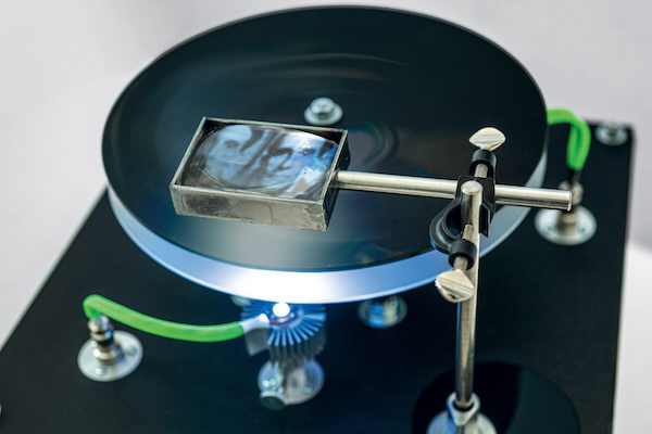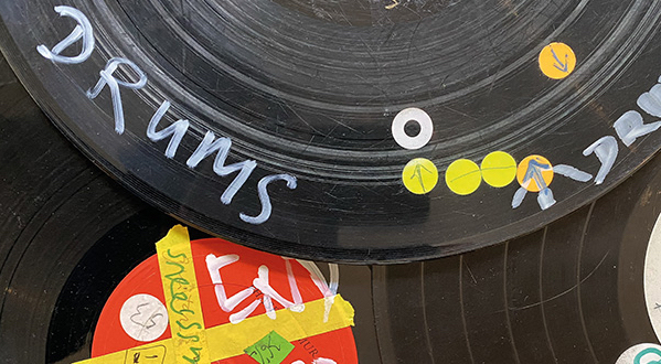 Parmi les pièces exposées figurent des vinyles lacérés, balafrés avec des pastilles et du scotch, rayés ou collés en morceaux… Des disques « préparés » pour ses performances justement. C’est principalement sur, avec et autour de ce support musical que Christian Marclay déploie sa pratique artistique liée au son, au bruit, à la musique et à l’image…