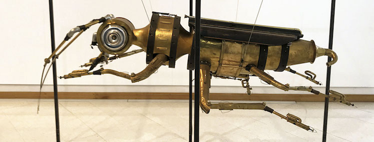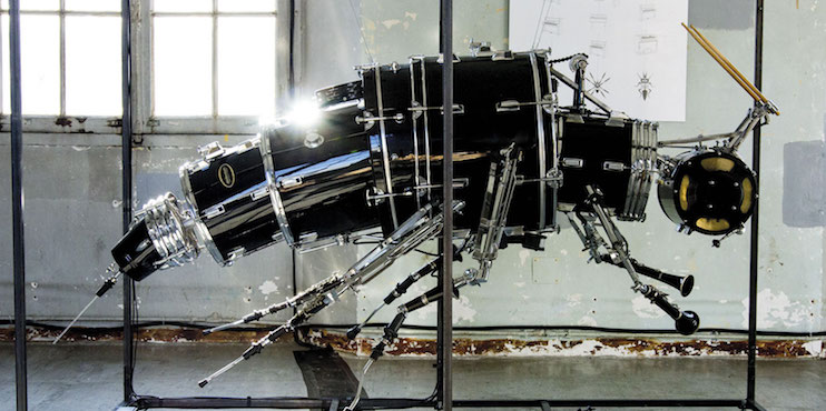 À mi-chemin entre robotique low-tech et sculpture sonore, le collectif Tout reste à faire (Mathieu Desailly, Vincent Gadras, David Chalmin) propose un étrange bestiaire. Des insectes géants composés à partir d’éléments de vieux instruments de musique (accordéon, harmonium, clavecin, ukulélé…) qui sont recyclés et réagencés. anima(ex)musica réunit une dizaine de créatures : sauterelle, méloé, scolopendre, cigale, doryphore, cloporte, punaise, scarabée…