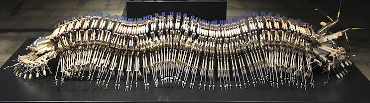 Cela fait maintenant près de dix ans que ce projet a été initié. Le bestiaire s’est agrandit progressivement. Il est présenté aux Champs Libres à Rennes selon une scénographie qui évoque les alvéoles d’une ruche. Cela permet de présenter trois points de vue différents de l’exposition à savoir : une vision dite souterraine, une vision au sol et une vision aérienne, reproduisant ainsi les trois niveaux possibles des biotopes propres aux insectes. Dernier né, un grillon sera finalisé durant le temps de cet événement, au cours de 3 séances d’atelier. Visible gratuitement jusqu’au 3 septembre, anima(ex)musica sera ensuite présentée à la Cité de la Musique – Philharmonie à Paris jusqu’au début de l’année prochaine.