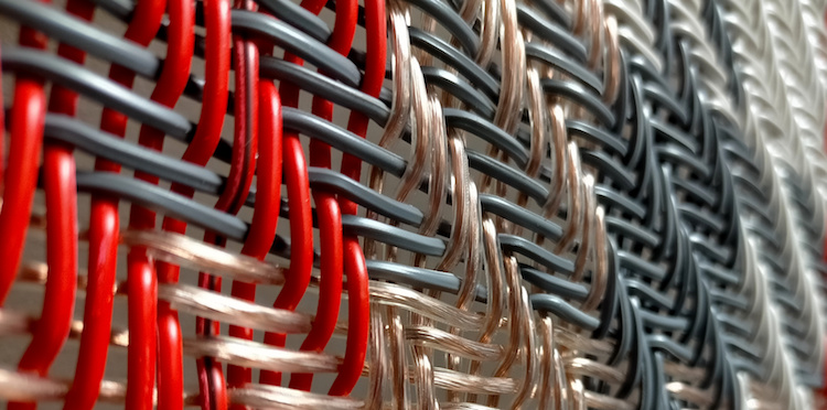 Malgré la généralisation du sans-fil, le câblage est encore très présent pour alimenter, recharger ou connecter les nombreux appareils que nous utilisons au quotidien. Avec les câbles audio, les fils électriques sont les plus répandus. C’est ce type de câbles qu’utilise Cécile Babiole dans une série d’œuvres présentées à l’issue d’une résidence au LABgamerz dans l’exposition Loops of the Loom, à Aix-en-Provence au Musée des tapisseries jusqu’en janvier prochain.