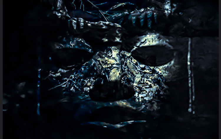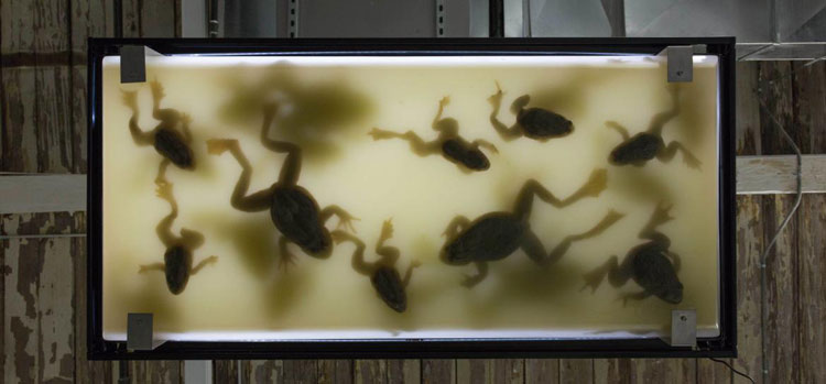 Concrètement, cette confrontation commence avec un ensemble d’éclairage suspendu comme on peut en voir dans une usine ou un hangar abandonné. Sauf qu’au lieu de la poussière et des insectes morts accumulés au fil du temps, ce sont des (fausses) grenouilles dont on aperçoit l’ombre par transparence. Fragment d’une installation de Dora Butor intitulée Adaptation of an Instrument, ce dispositif est censé réagir au passage des visiteurs grâce à un système régit par des réseaux neuronaux. En contrepoint, les agrandissements photographiques du génome d’Annick Lesne et Julien Mozziconacci (chercheurs en génie génétique, CNRS & UPMC) nous plongent dans les arcanes secrets du vivant. Même impression de transfiguration devant les macros de Gwendal Sartre où les détails d’une chevelure prennent l’allure de paysages dantesques (J’ai gravé dans ses cheveux).