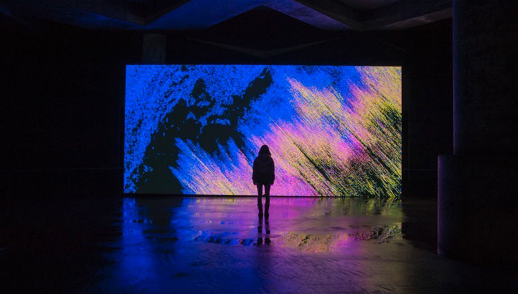 Le vent, l’eau, le sable — ou, pour résumer, la mécanique des fluides — sont source d’inspiration pour de nombreux artistes. À commencer par Hicham Berrada, Sylvain Courrech du Pont et Simon de Dreuille avec Infragilis qui met en œuvre une maquette dans laquelle sont dispersées de fines particules qui s’assemblent, composent et recomposent un désert en miniature dont on peut observer les variations en grand format sur une vidéoprojection. En modélisant le ressac de la mer sur des rochers, au travers de son installation algorithmique En recherchant la vague, Gaëtan Robillard illustre cette « géométrie des formes inhabituelles » (tribute to Maryam Mirzakhani…) renforcée par les propos de Bernard Stiegler diffusés en bande-son. Ryoichi Kurokawa fait également « danser » des particules en suspension, de manière saccadée et scandée par de l’electronica noisy pour son installation holographique, Mol. D’un abord moins évident — avec, au sens strict, un titre en trompe l’œil : La Clepsydre — l’installation vidéo cubique de Sylvie Chartrand finit par dévoiler de façon parcellaire les contours d’une silhouette humaine.