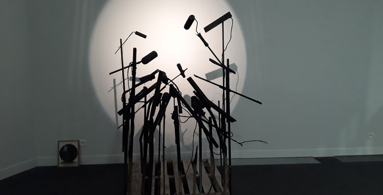 Continuant notre déambulation dans ce lieu exceptionnel, nous passons devant la vidéo de Julius von Bismarck, A Race For Christmas, qui nous laisse un peu pantois, mais il faut dire que nous n’avons jamais focalisé sur un cheval fut-il déguisé en… cheval ! Reste que l’idée, aussi saugrenue soit-elle, nous oblige à mettre en question notre regard, à douter de ce que l’on voit. Expérience troublante. L’ensemble monographique d’Olivier Morvan propose aussi de nombreuses pièces qui interrogent notre perception en pointant ce qui est absent… Aucune personnalité sous le projecteur devant la forêt de micro (Le Cercle de Craie), personne non plus sur le fauteuil roulant qui semble pourtant en mouvement (Morituri I)… Qualifiées de « petites usines à fiction », ces évocations fantomatiques témoignent d’un travail qui s’échelonne de 2007 à 2019.