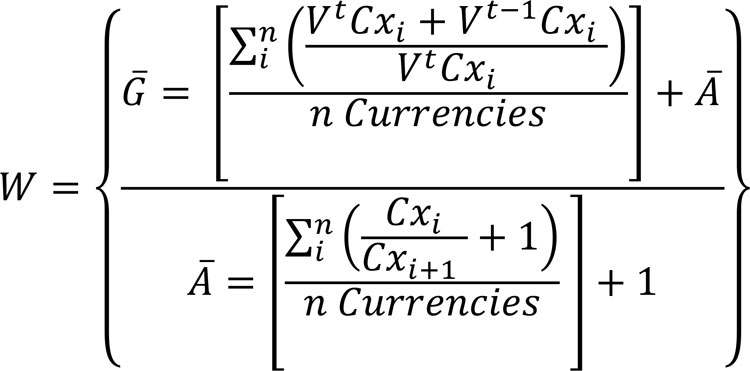 L’équation illustre la manière dont le (W) est calculé à travers un agrégat de valeurs de taux de change d’un panier boursier de devises dominantes compris entre les gains et les pertes que leurs fluctuations génèrent sur la durée. La moyenne mathématique des valeurs de devise dans le panier (A) assure la stabilité du (W). Les gains compensent les pertes dans la moyenne générale (G). Le diagramme illustre la manière dont un algorithme peut agréger automatiquement le (W) en associant les devises à partir des multiples dépôts de réserves et se basant sur le calcul récursif de l’équation (W).