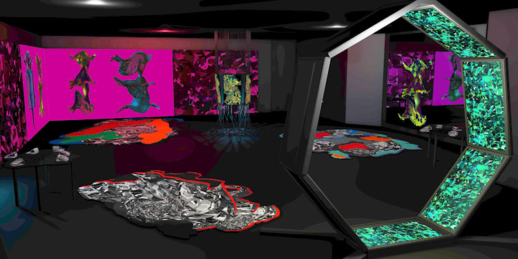 Une constance dans les créations de Pia MYrvoLD, comme on peut le constater au travers des autres œuvres réunies pour Art Avatar 2. C’est tout un bestiaire fluctuant et coloré, une galerie de formes mouvantes telles des créatures marines, des vers à soie enroulés dans leur fil, des grappes de mercure en suspension, des monstres aquatiques, des geysers qui explosent au ralenti ou entités extraterrestres qui lévitent sur les écrans agissant comme des miroirs démultipliés. Dans cette expérience visuelle sans cesse renouvelée, ces peintures et sculptures 3D conservent des rondeurs rassurantes, même si parfois quelques excroissances anguleuses et déplacements intempestifs peuvent paraître menaçants. La raison de cette « bienveillance » esthétique tient sans doute à la figure de la déesse-mère, aux Vénus chères à Pia MYrvoLD.